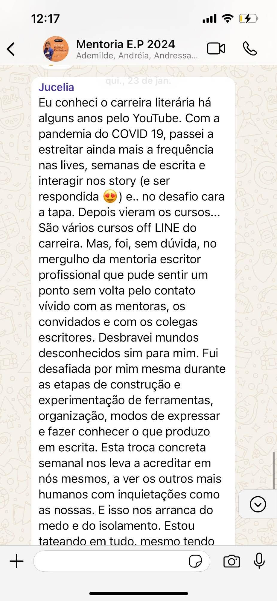 A mentoria Escritor Profissional do Carreira Literária oferece um espaço seguro para compartilhar ideias e fazer perguntas. É evidente o quanto os mentores se preocupam em elevar a indústria literária no país. Sérios, competentes e disponíveis, eles trazem informações preciosas sobre o mundo editorial, observada de todos os ângulos, em aulas semanais. As ferramentas apresentadas servem como um guia de como solidificar e manter uma carreira com a escrita. Para mim, a experiência foi um divisor de águas. Me sinto muito mais confiante como escritora com a bagagem de conhecimento adquirida ao longo do ano.