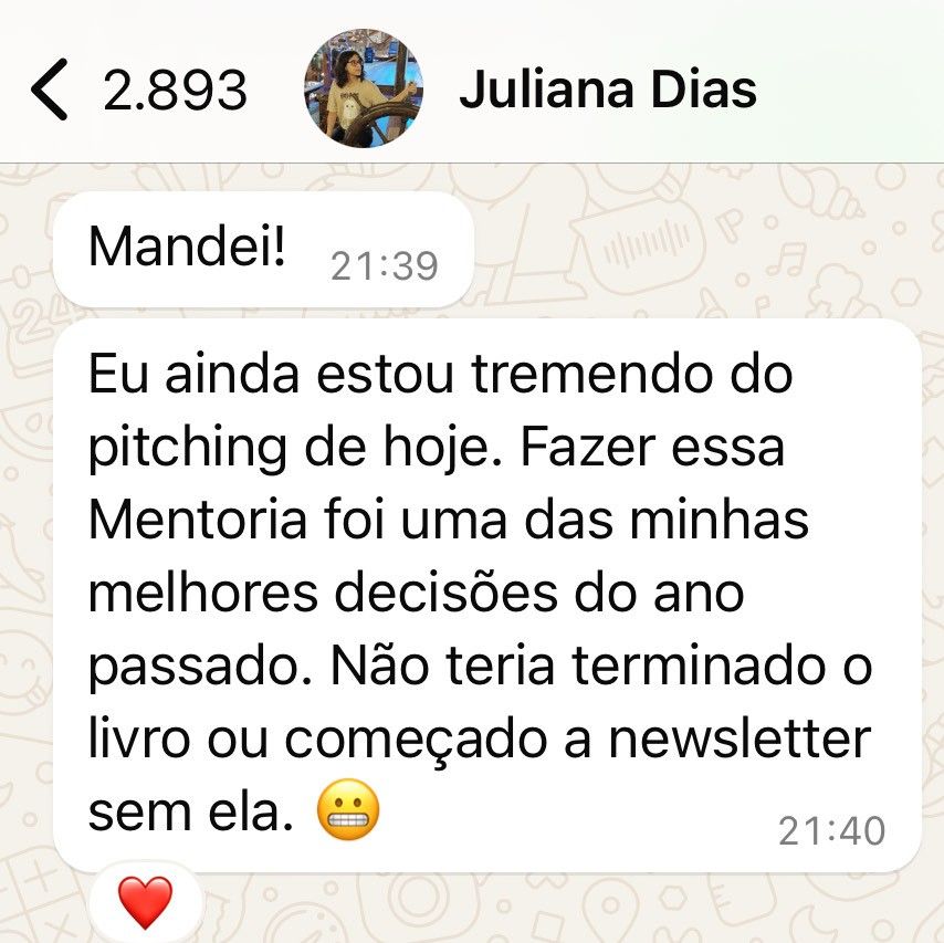 A mentoria foi um acelerador na minha carreira de escritora. O que eu levaria cinco, dez anos para perceber sozinha, foi condensado num ano de encontros desafiantes e dinâmicos. Tive a chance de viver todas as etapas na publicação de um livro de forma profissional, de conhecer editoras e de praticar os famosos pitchings. Tudo com o suporte de profissionais experientes. É muito bom tirar suas dúvidas com pessoas que você confia. E ter quatro editoras lendo o meu original, não tem preço!